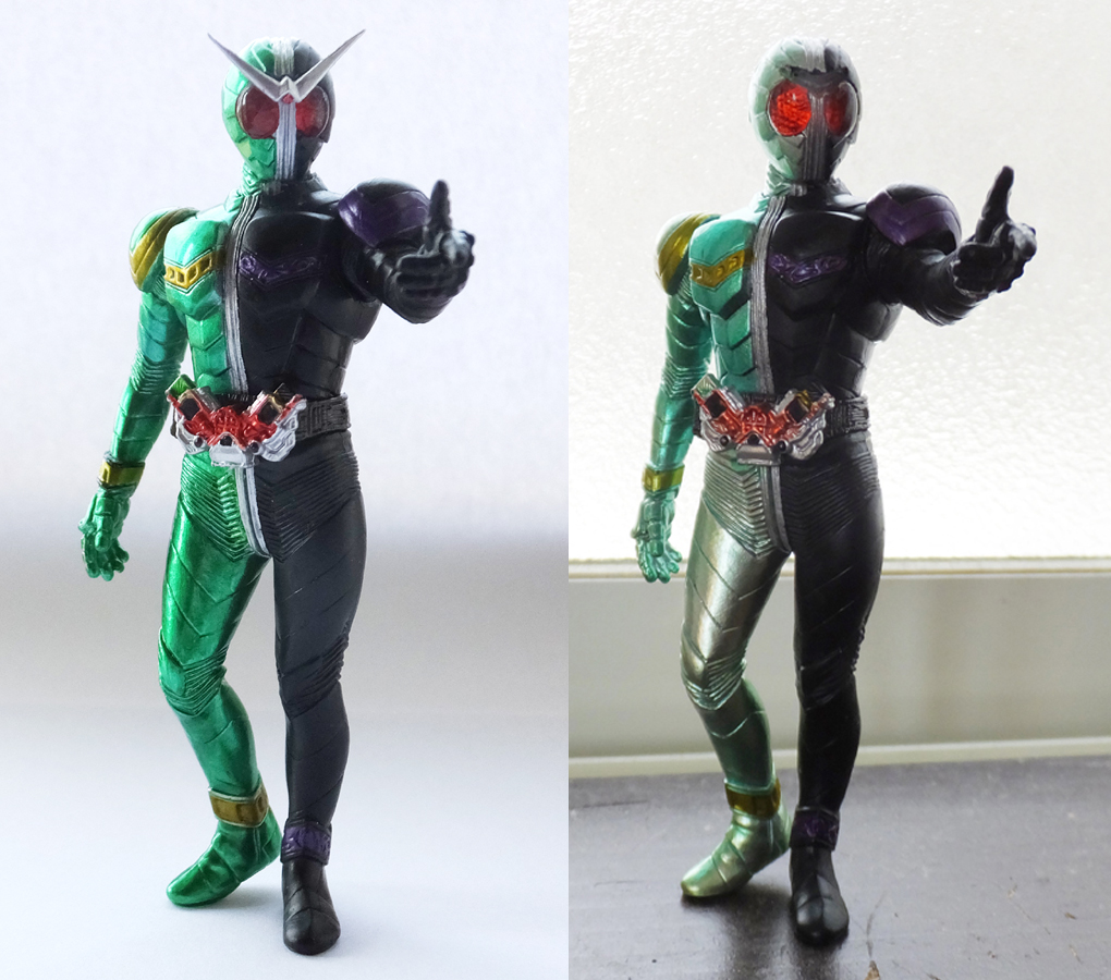 サイクロン!ジョーカー! フィギュア・おもちゃ 2016年05月23日 さて、何年か前(爆)から放置していたHD系列の仮面ライダーWをリペしてみました。退色が激しかったもんで塗り直しただけですがねwメタリックグリーンとクリアグリーンを混ぜたりしてみたもののなかなか上手い具合に行かず難儀しました。途中で飽きて「大体こんなもんでいいや!」というノリでこんな色に。 児童誌なんかの画像をちょいと見て見ると意外と緑が黄緑っぽいのでびっくり。おいらは少しはっきりした緑色が好きなのでまぁいいや。 リペ前と比べて。 額のアンテナはオリジナルのものを折ってしまってたので、HDMの仮面ライダージョーカーからもらってきました。オリジナルのアンテナよりもシャープになったのでいい感じじゃないですかね。しっかし、イラスト描けない日が続く…週末に描きたいけど、こういう時に限って飲み会だよ!! [0回]PR